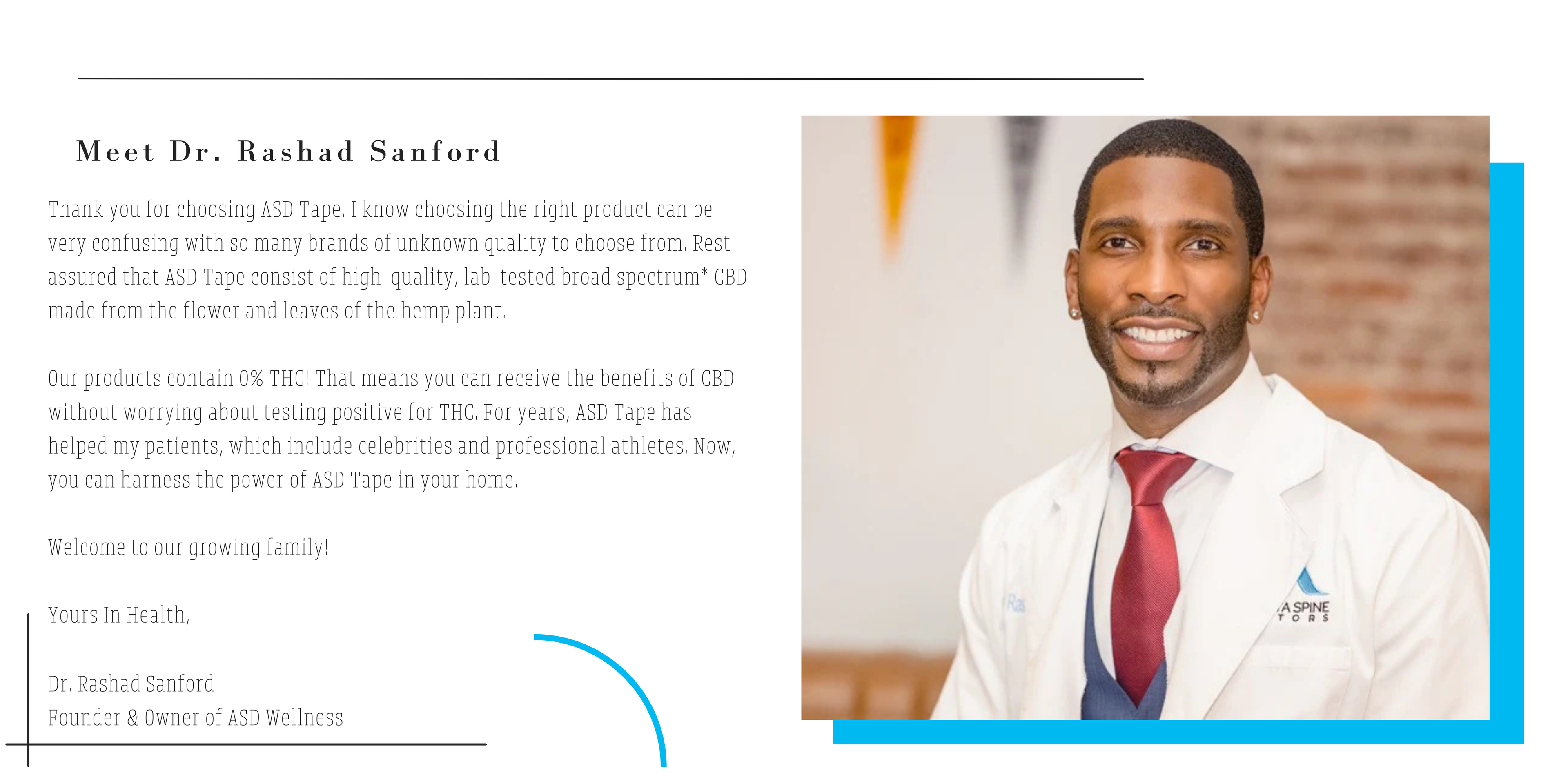 ASD Tape was developed and founded by Dr. Rashad Sanford. Dr. Sanford is a renowned celebrity doctor and wellness coach, entrepreneur, and philanthropist.